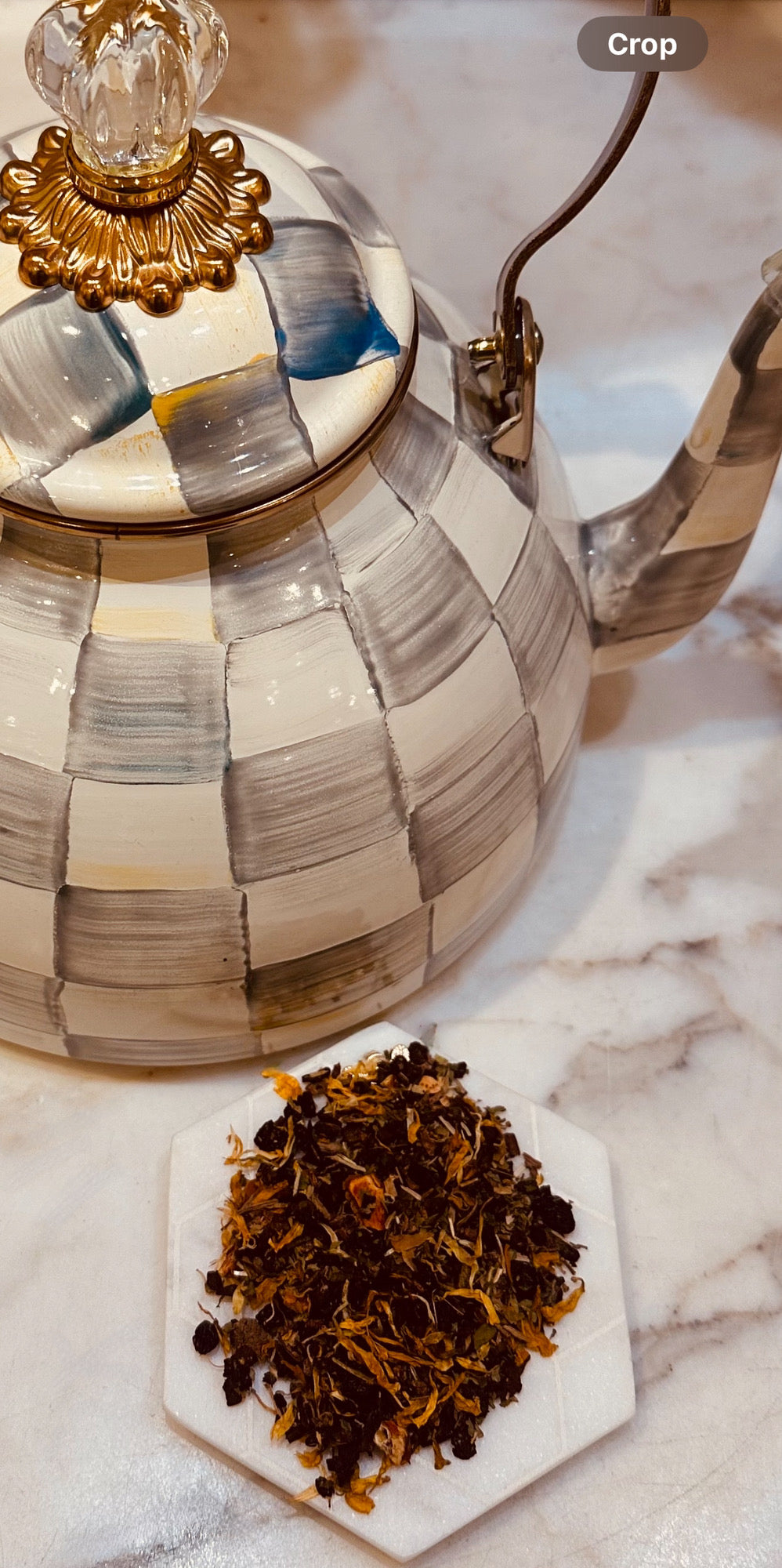Take a pause with our Coffee Break Tea—a rich and satisfying herbal blend that brings the comfort of coffee without the caffeine.Roasted chicory root and carob create a warm, toasty depth, while currants and Bael nut add natural sweetness and smoothness. Delicate calendula and marigold petals finish the cup with a gentle floral lift. Making every sip feel cozy and balanced.Perfect for mornings, afternoons, or evenings, this naturally caffeine-free tea supports wellness and relaxation while giving you the same satisfaction as your favorite coffee break without the crash.